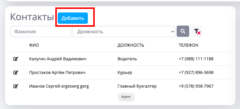 2. Найдите блок Контакты и нажмите на кнопку "Добавить"