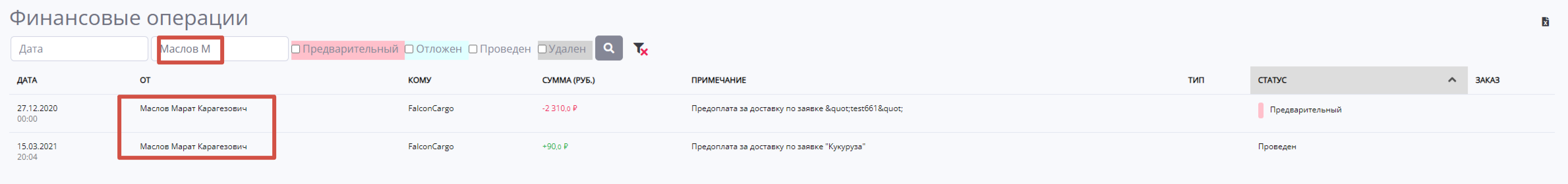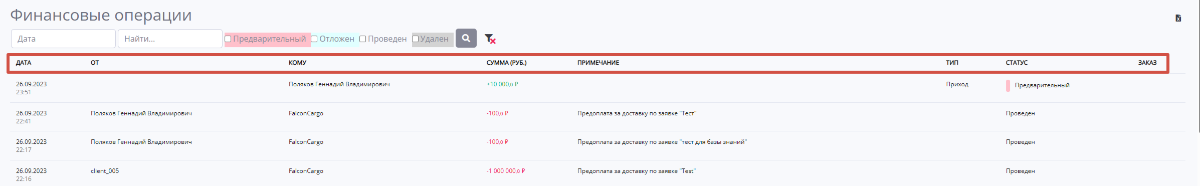 Кроме того, пользователь может отсортировать данные по различным параметрам, таким как сумма операции, комментарий, тип операции, статус и заказ. Это позволяет легко организовать информацию и сделать ее более удобной для анализа и дальнейшей работы.