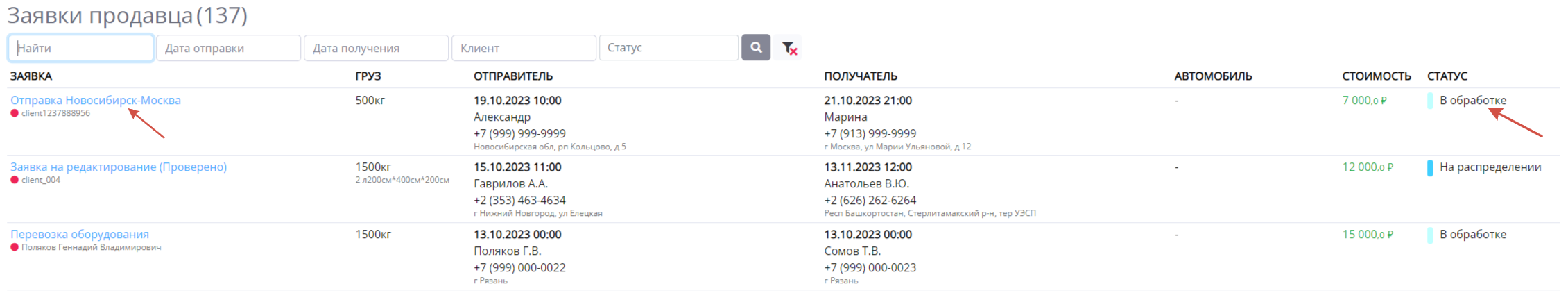 Менеджер также может отслеживать цепочку движения заявки по статусам таким, как: