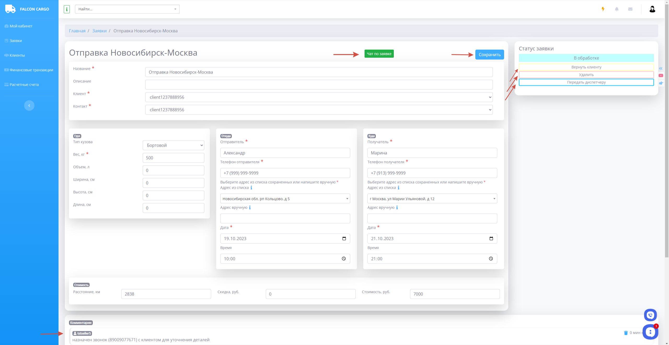 4.Отправить диспетчеру для дальнейшего назначения водителя и грузового авто.