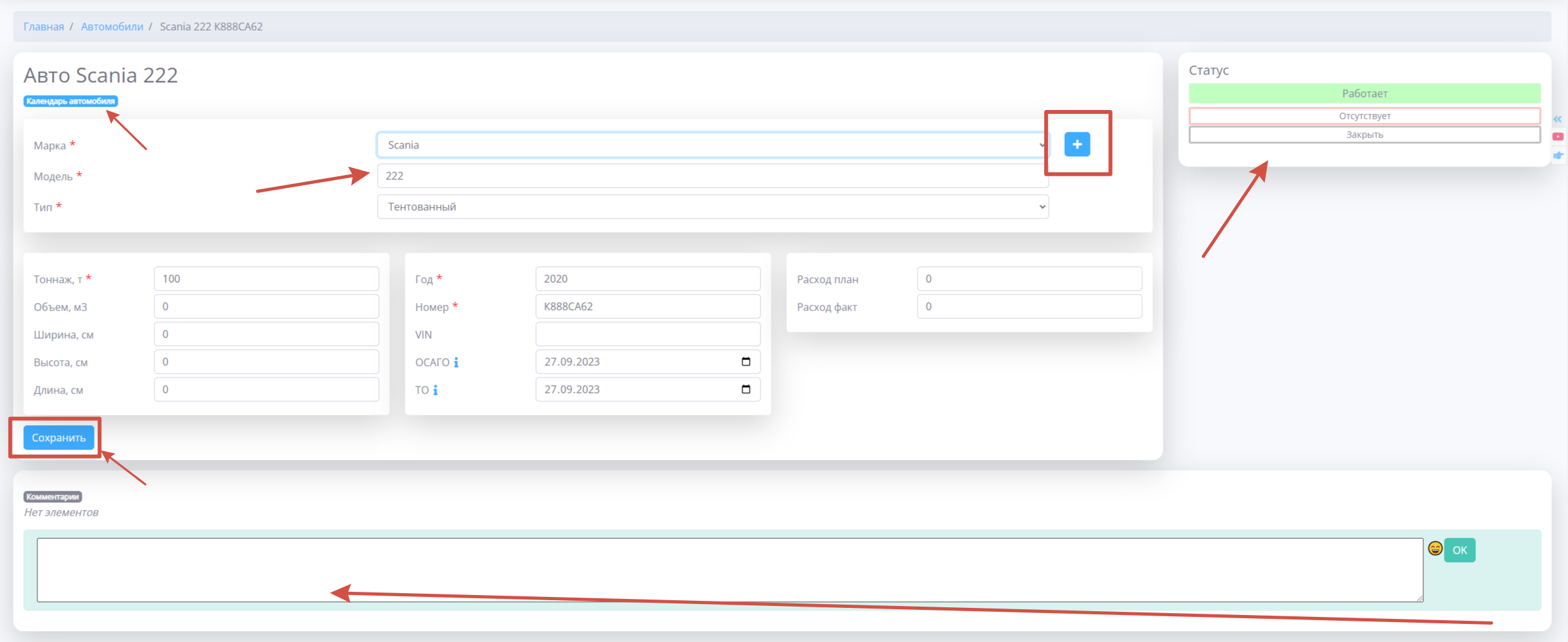 Заполните необходимую информацию об автомобиле, смените статус, проверьте и заполните Календарь. При завершении можете также оставить комментарий к профилю. И сохраняйте. Объект будет обновлен.