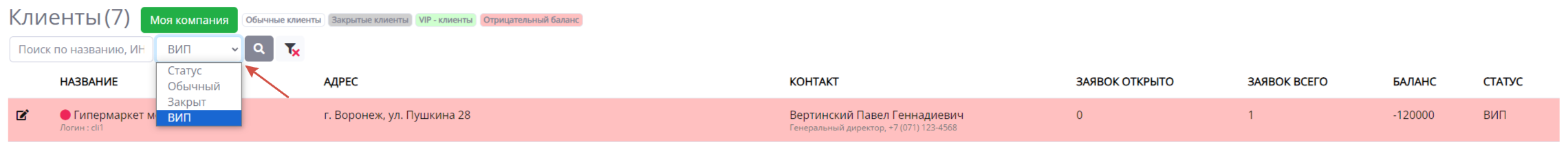 - Фильтр по статусу клиента: Обычный, Закрыт, ВИП и можно снова выбрать Статус ( чтобы сбросить данный фильтр).