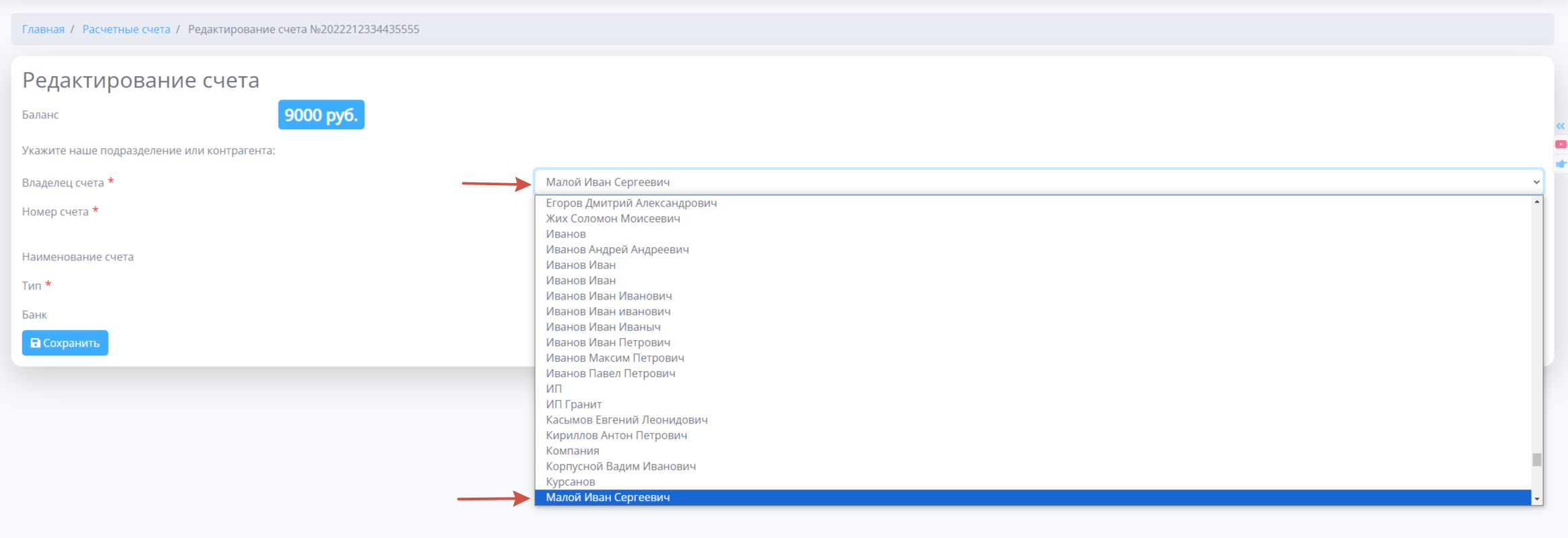 Далее перед вами откроется форма с данными. Любые данные вы можете исправить, даже закрепить счет за другим пользователем: