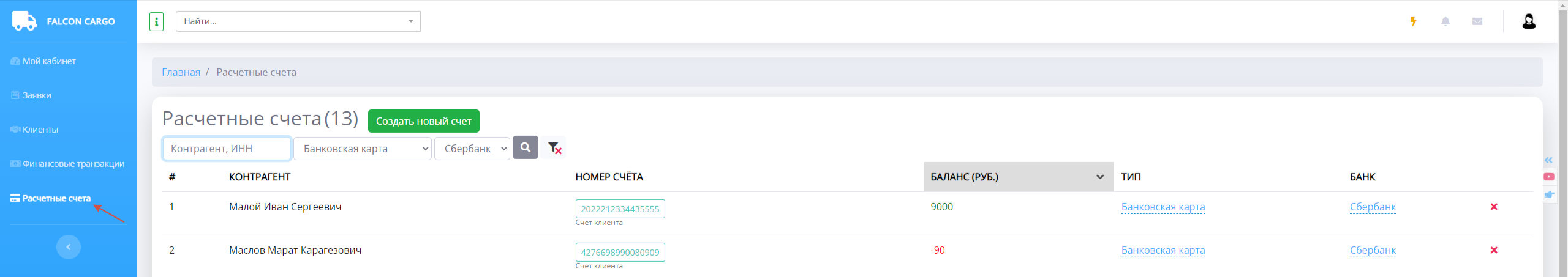 Для того, чтобы перейти к расчетным счетам клиентов, нужно перейти в соответствующий раздел: