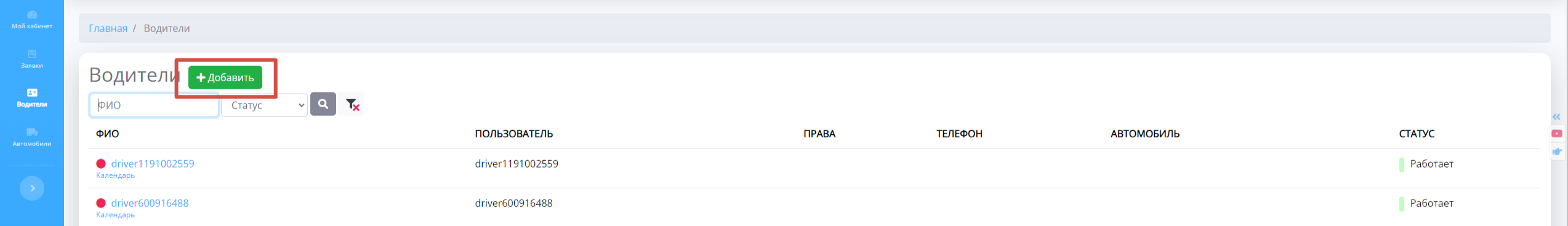 1. Перейдите в раздел Водители и нажмите на кнопку "+Добавить"