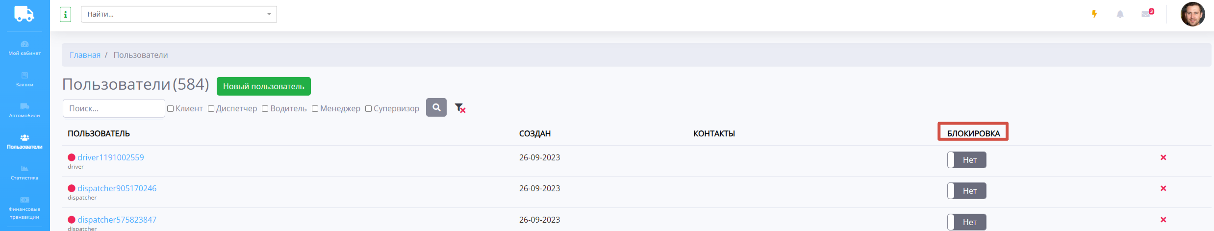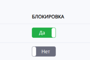 Нажмите на переключатель "Нет" и пользователь будет заблокирован. Разблокировка происходит таким же образом.